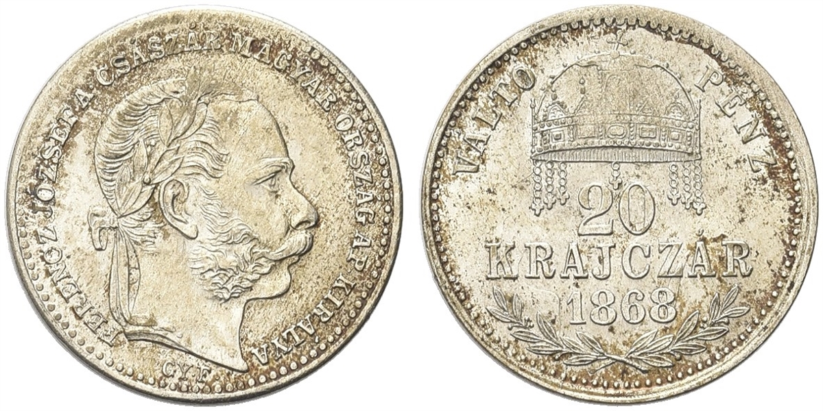 UNGHERIA - Francesco Giuseppe I d’Asburgo Lorena, 1848-1916. - 20 Kreuzer 1868, Kremitz.
