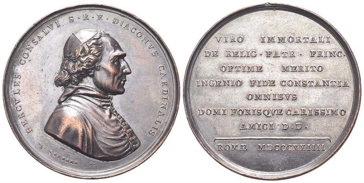 Dr. HERCVLES CONSALVI S R E CARDINALIS. Busto del Cardinale a s.; sotto, G CERBARA. Rv. VIRO IMMORTALI / DE RELIC PATR PRINC / OPTIME MERITO / INGENIO FIDE CONSTANTIA / OMNIBVS / DOMI FORISQUE CARISSIMO / AMICI D D; in esergo, ROMAE MDCCCXXIIII. Iscrizione su otto righe.