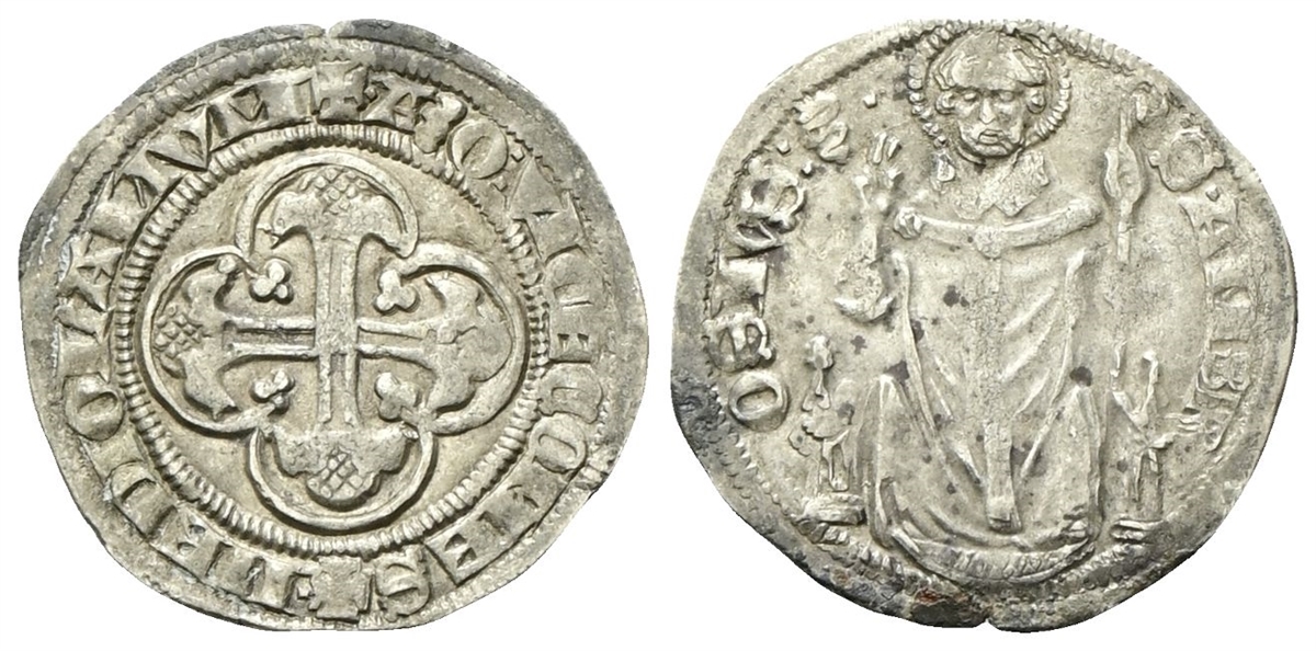 Dr. A3O VICECOMES MEDIOLANVM. Croce gigliata in doppio quadrilobo ornata di quattro trifogli. Rv. S AMBR - OSIVS. Sant'Ambrogio, frontale e seduto su trono, regge pastorale e solleva la d. per benedire.