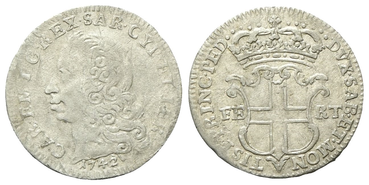 Dr. CAR EM D G REX - SAR CYP ET IER. Testa a s. con lunghi capelli; sotto, 1742. Rv. DVX SAB ET MON - TISF PRINC PED. Scudo coronato; ai lati, FE - RT.