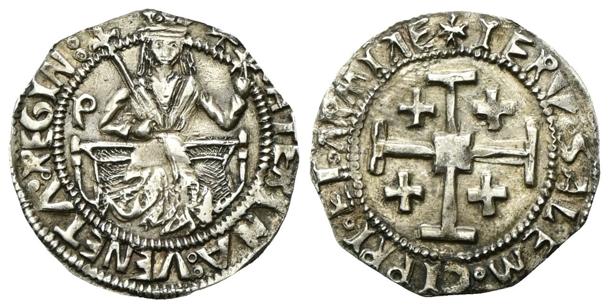 Dr. +KATERINA:VENETΛ:REGIN:. La Regina, in trono, tiene il globo e lo scettro; s., P. Rv.+IERVSΛLEM•CIPRI•ET•ΛRMIΛE. Croce di Gerusalemme accantonata da quatro crocette.