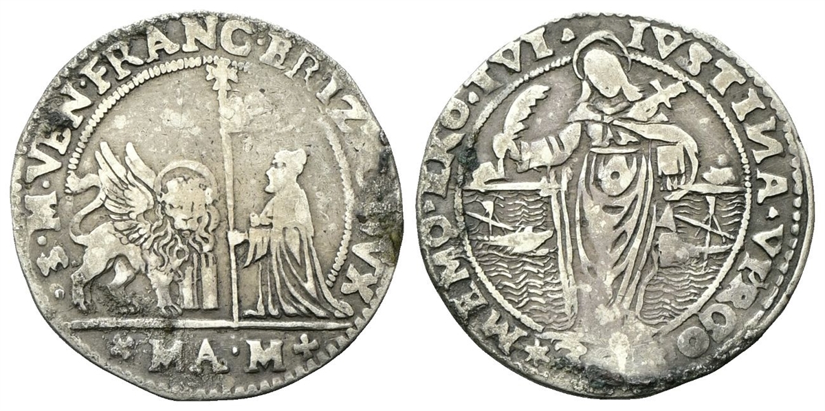 Dr. •S•M•VEN•FRANC•ERIZZO DVX. Il Leone alato verso s. con la zampa anteriore appoggiata sul libro aperto; a d., il doge genuflesso con vessillo; in esergo, +MA•M+ (Marcantonio Malipiero massaro). Rv. ✶MEMO•ERO•TVI• - IVSTINA▴VIRGO✶ (N speculare). Santa Giustina stante di fronte, con il seno trafitto da pugnale, tiene nella mano d. una palma e regge il libro nella s.; sullo sfondo, galere in navigazione.