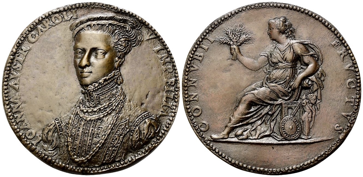Dr. IOANNA AVSTR CAROLI V - IMP FILIA. Busto di scorcio verso s., con un colletto alto, una catena, un orecchino, capelli ornati di gioielli e un berretto piatto piumato. Rv. CONNVBII - FRVCTVS. Figura muliebre seduta verso d., che tiene quattro spighe di grano, uno scudo, una lepre; ai suoi piedi, una lancia e un'erma poggiano sulla sua sedia.