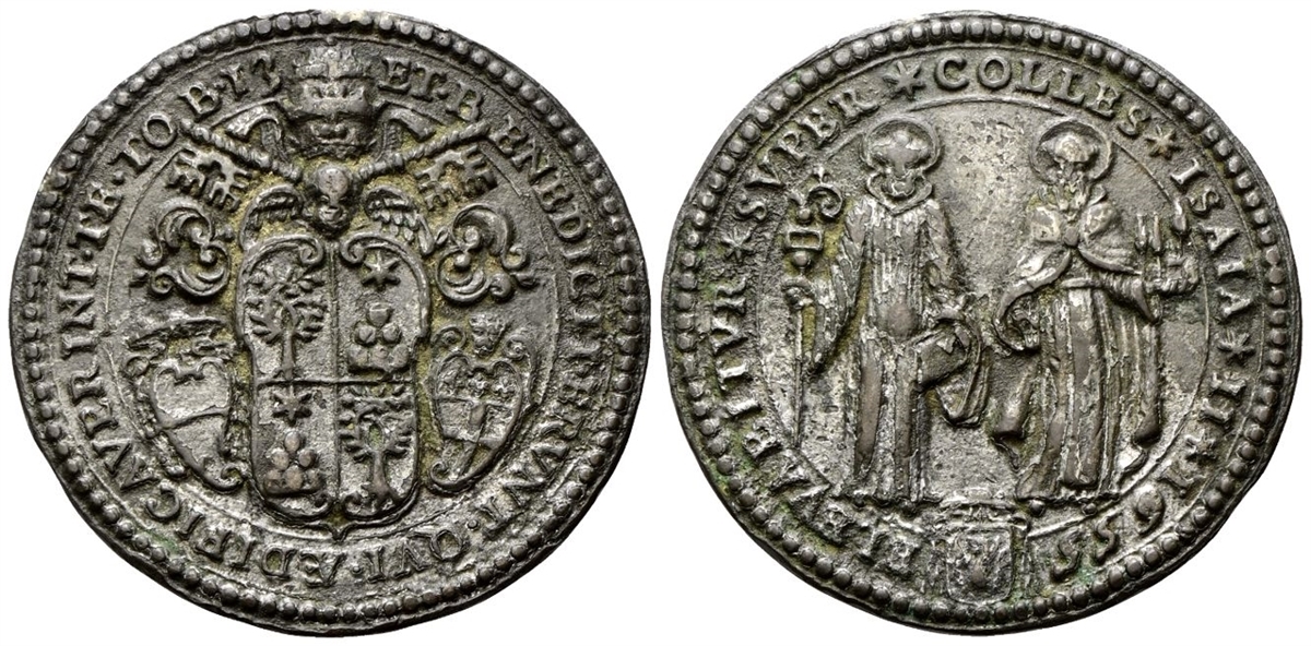 Dr. ET B - ENEDICTI ERVNT QVI AEDIFICAVERINT TE TO - B 13. Stemma papale sormontato da triregno e chiavi decussate; ai lati, stemma del Card. Lomellini e della città. Rv. ELEVABITVR SVPER COLLES ISAIA II 1655. San Benedetto e San Romualdo stanti e frontali.