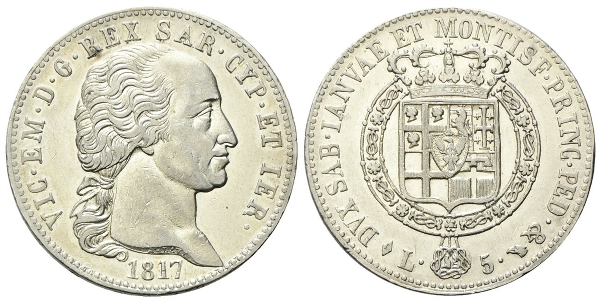 Vittorio Emanuele I, 1802-1821. 5 Lire 1817 Torino, I Tipo.