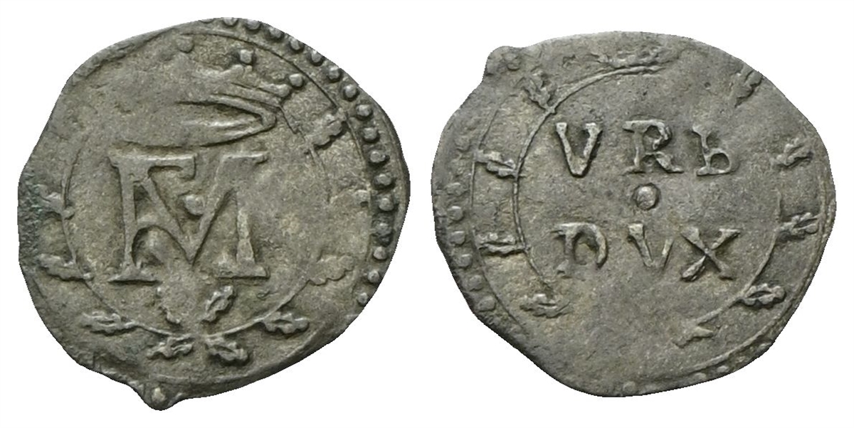 Dr. Monogramma coronato entro corona di foglie di quercia. Rv. VRB / • / DVX. Iscrizione disposta su tre righe entro corona di foglie di quercia.