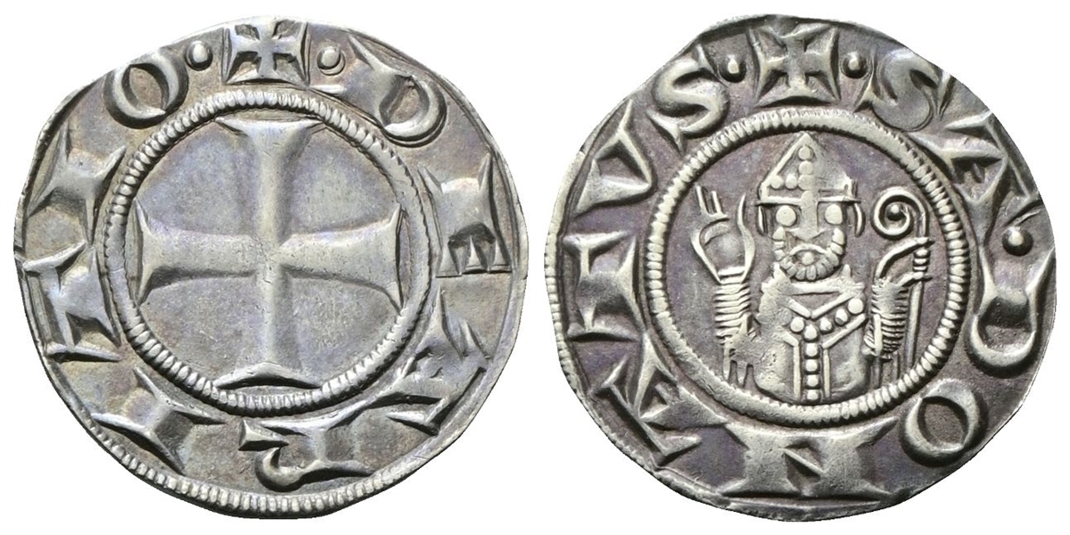 Dr. + • DE ARITIO•. Croce. Rv. + • SA• DONATVS•. Mezza figura del Santo frontale, tiene pastorale e benedice.