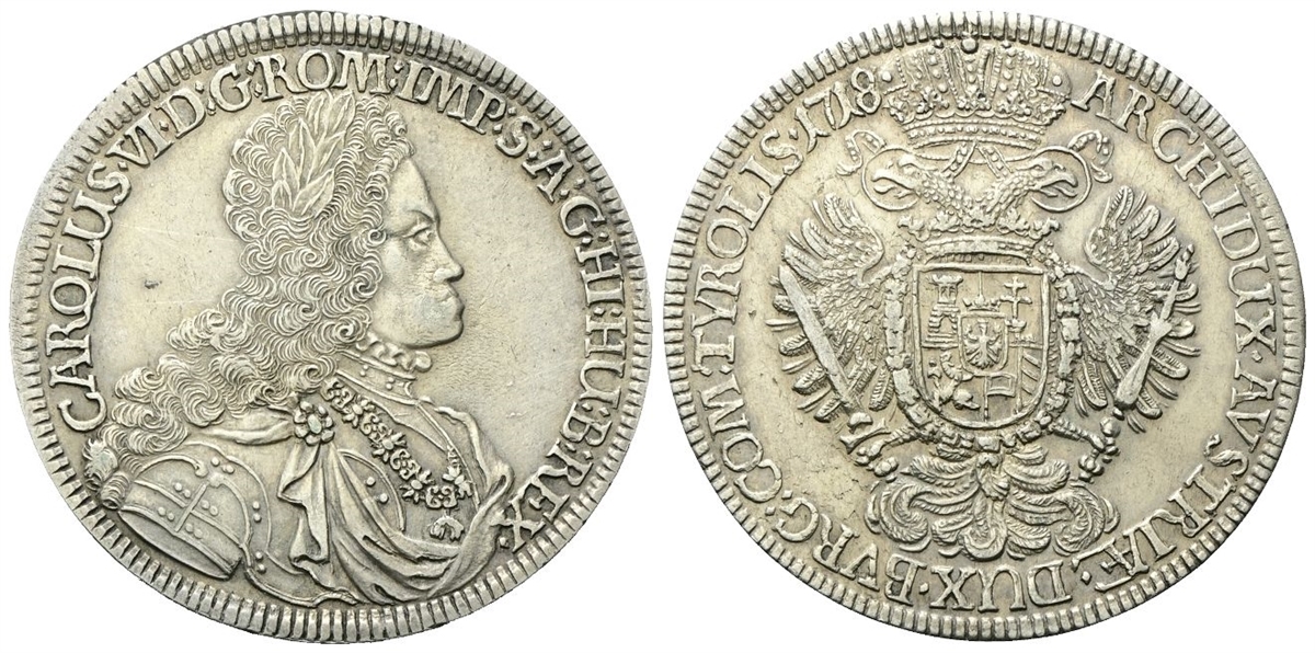 Dr. CAROLUS✦ VI✦ D: G: ROM: IMP: S: A: G: HI: HU: B: REX✦. Busto laureato, corazzato, paludato, con lungo parruccone a d.; sul petto, collare del Toson d’Oro. Rv. ARCHIDUX✦ AVSTRIAE✦ DUX✦ BVRG: COM:TYROLIS✦ 1718✦. Aquila imperiale bicipite coronata e con scettro e spada.