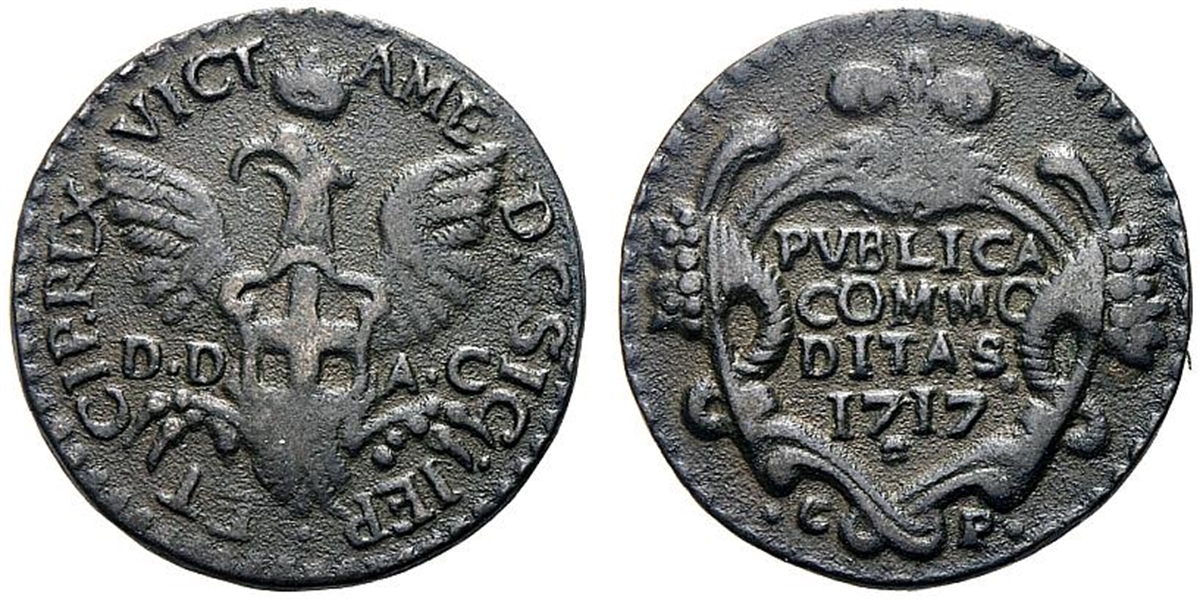 Dr. Aquila coronata ad ali spiegate, con scudo crociato caricato in petto. Rv. PVBLICA COMMO DITAS 1717 in cartella ornata ai lati da cornucopie.
