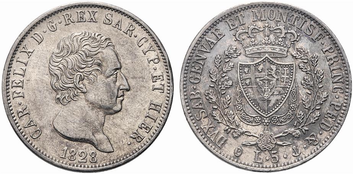 Carlo Felice, 1821-1831. 5 Lire 1828 Genova.