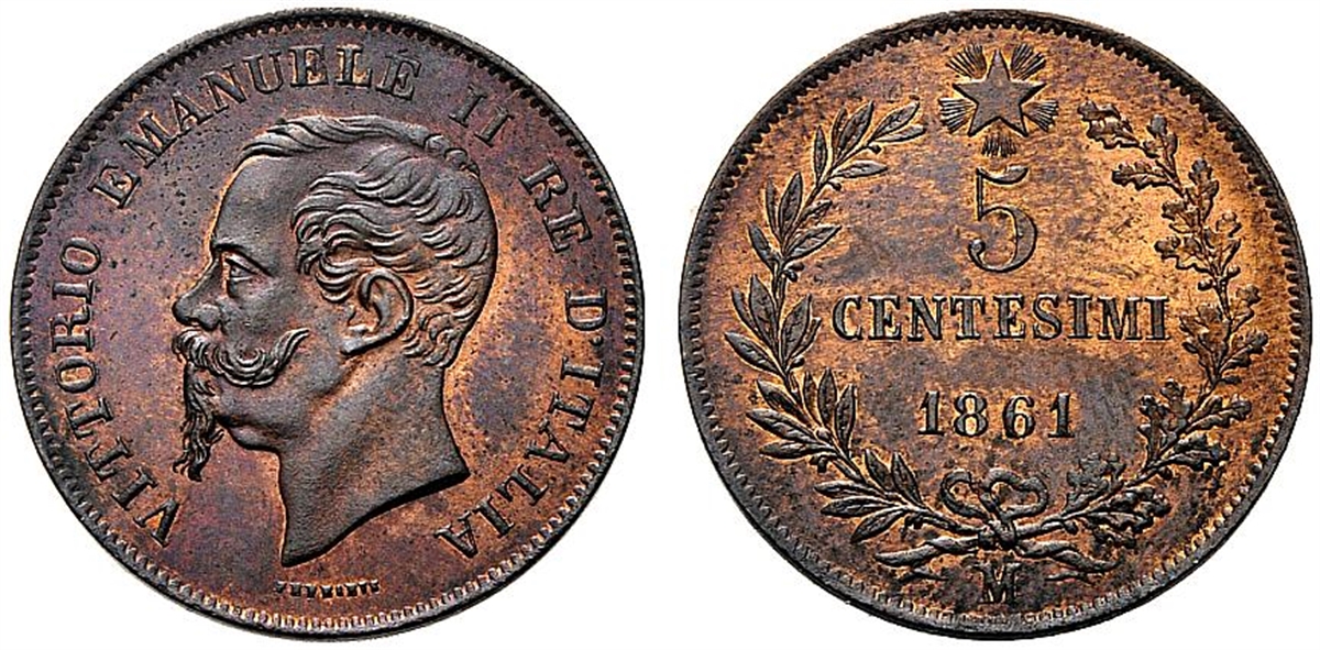 Vittorio Emanuele II, 1861-1878. 5 Centesimi 1861 Milano.