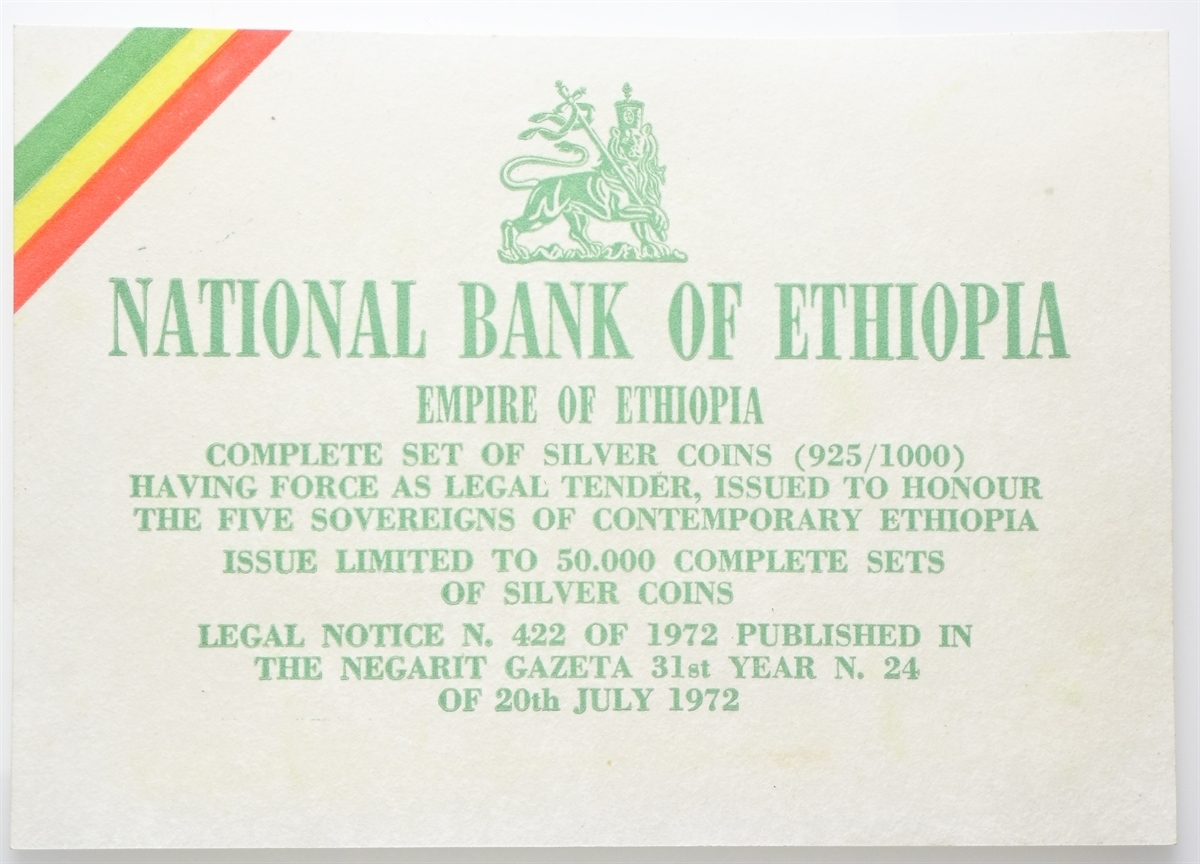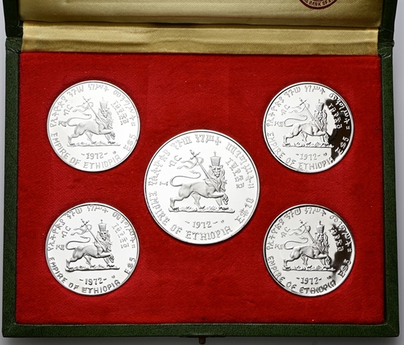 Haile Selassie I, 1930-1974. Set 1972 composto da n. 1- 10 Dollari e n. 4 - 5 Dollari, 5 Sovrani del Regno di Etiopia.