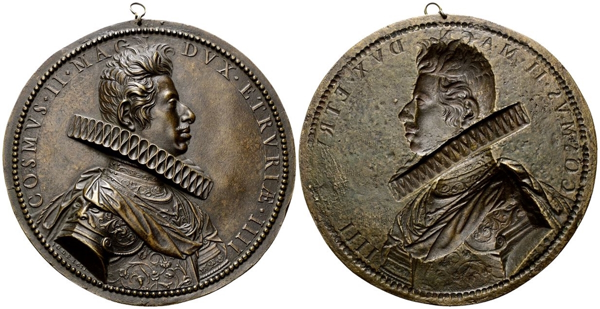 Eccezionale esemplare originale di uno dei più grandi fonditori di tutti i tempi. Dopo l’assassinio di Enrico IV di Francia, avvenuto nel 1610, la reggente Maria de’ Medici suggerì al Duprè un viaggio in Italia. Nel 1613 alla Corte di Toscana, esegue quattro magnifici medaglioni uniface: questo per il Granduca, e poi per la madre Cristina di Lorena, per la moglie Maria Maddalena d’Austria e per il fratello Francesco, principe di Capistrano.