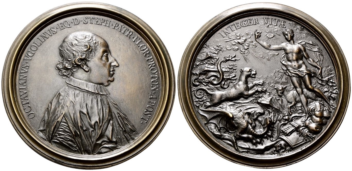 Dr. OCTAVIANVS VGOLINVS EQ D STEPH PATR FLOR PROTON APOST. Busto a d., con mantello. Rv. INTEGER VITAE. L'Integrità stante verso s. su armi accatastate, respinge una pantera, dei serpente e un drago; alla sua d., un agnello.