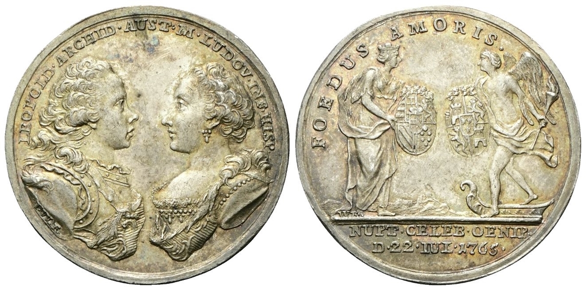 Dr. LEOPOLD ARCHID AUST M LUDOV INF HISP. Busti affrontati degli sposi; a s., sul taglio della spalla, L W F. Rv. FOEDUS - AMORIS. Figura dell'Austria coronata a s., con stemma partito di Lorena e Toscana, attende Imeneo, che scende da un'imbarcazione e reca con sè la torcia accesa e lo stemma di Spagna; sopra la linea di esergo, a s., W F; in esergo, NUP CELEB O
