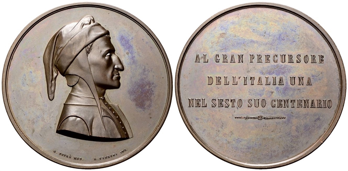Dr. Busto del Poeta a d.; sotto, G DUPRé MOD A PIERONI INC. Rv. AL GRANDE PRECURSORE DELL’ITALIA UNA / NEL SESTO SUO CENTENARIO. Iscrizione disposta su tre righe.