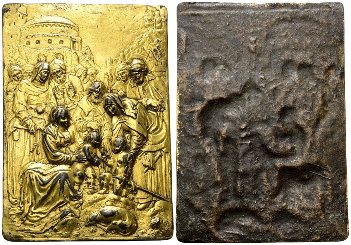 XVII secolo. Placchetta rettangolare con Sacra Famiglia, San Giovannino, Sant’Elisabetta, San Zaccaria, Sant’Anna e San Gioacchino.