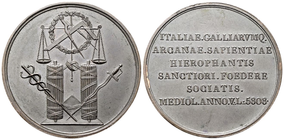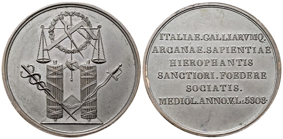 Dr. Due fasci littori legati da un nastro; a sinistra, un caduceo; a destra, una spada serpeggiante; sopra, compasso, squadra e bilancia, entro ghirlanda. Rv. ITALIAE GALLIARVMQ / ARCANAE SAPIENTIAE / HIEROPHANTIS / SANCTIORI FOEDERE / SOCIATIS / MEDIOL ANNO VL 5808. Iscrizione disposta su sei righe.