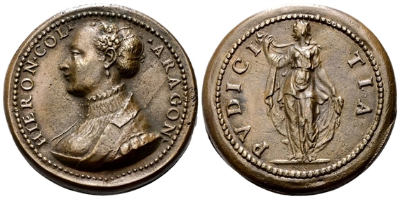 Dr. HIERON COL - ARAGON. Busto a s., con veste a collo alto, con capelli raccolti, indossa orecchino di perle. Rv. PVDICI - TIA. Personificazione della Pudicizia stante, testa rivolta a s., mentre solleva la veste con la mano destra.