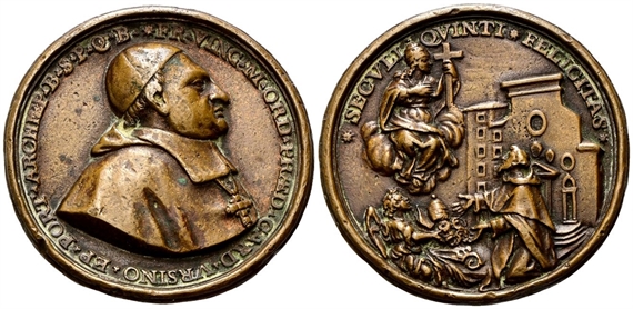 Dr. FR VINC M ORD PRAED CARD VRSINO EP PORT ARCHIEP B S P Q B. Busto a d., con zucchetto e abito talare. Rv. SECVLI - QVINTI FELICITAS. San Domenico genuflesso verso d. prega dinanzi alla Religione seduta sulle nubi con triregno e crocifisso.