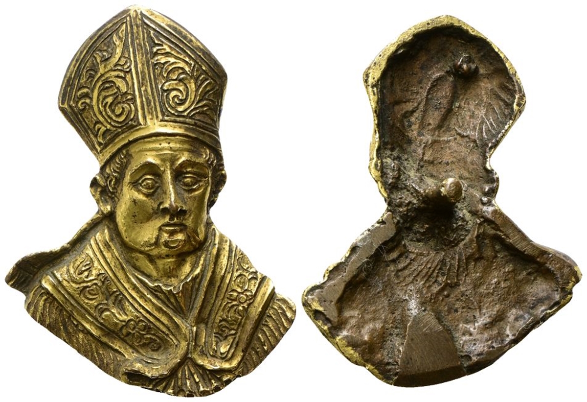 Dr. Busto del Santo con Mitra e abito vescovile, di scorcio, verso s. Rv. Perno di fissaggio.
