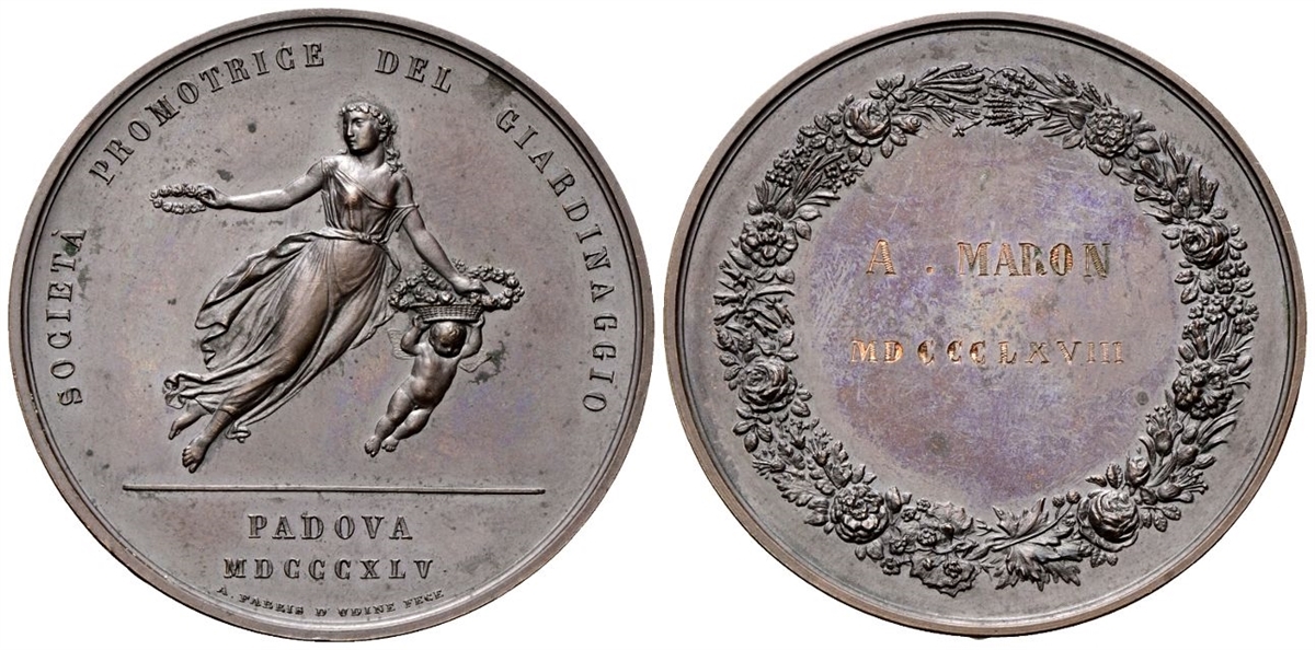 Dr. SOCIETA' PROMOTRICE DEL GIARDINAGGIO. Figura velata e librata verso d. regge serto d'alloro preso da cesto retto da un putto; in esergo, PADOVA / MDCCCXLV / A FABRIS D'UDINE FECE. Rv. A MARON / MDCCCLXVIII. Iscrizione (incisa) disposta su due righe entro serto di fiori.