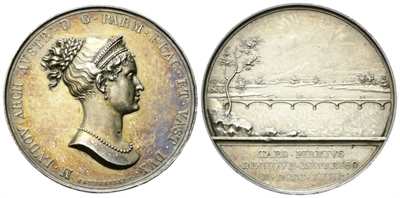 Dr. M LVDOV ARCH AVSTR D G PARM PLAC ET VAST DVX. Busto diademato a d.; sotto il nome dell’artista, SANTARELLI F. Rv. Il nuovo ponte sul fiume; in esergo, TARO IRMIVS / DENIQVE REPRESSO / M DCCC XVIII. Iscrizione disposta su tre righe.