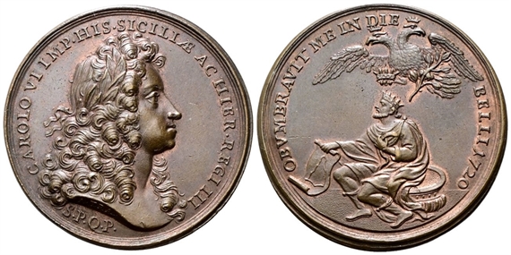 Dr. CAROLO VI IMP HIS SICILIAE AC HIER REGI III. Busto laureato a d., con lunga capigliatura a ricci ricadente sulle spalle; sulla troncatura del busto, A TRA; sotto, SPQP. Rv. OBVMBRAVIT ME IN DIE - BELLI 1720 .Il Genio di Palermo, seduto su di una conca d’oro, regge con la d. una carta della Sicilia trattiene con la s. un serpente che gli sta sul petto, mentre un’aquila bicipite coronata, gli vola sul capo, reggendo una co