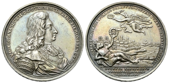 Dr. VICTOR AMADEVS II D G DVX SABAV PRINC PIEMONT REX CYPRI.Busto corazzato e drappeggiato a d.; sulla troncatura della spalla, H. Rv. GALLIS PROFLIGAT VALLO PERRVPTO CASTRIS CVM RE TORMENTAR DIREPTIS. Veduta della città e dei suoi bastioni; sopra, la Vittoria in volo verso s. regge una corona e un serto di alloro; sulla linea di esergo, il Po sdraiato verso d.,regge un badile, versa