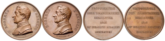 Dr. ROBERTO - D’AZEGLIO. Busto a s., G FERRARIS F. Rv. PROPUGNATORE / DELL’EMANCIPAZIONE ISRAELITICA / 1848 / GL’ISRAELITI SUBALPINI / AMMIRATORI. Iscrizione disposta su sei righe.