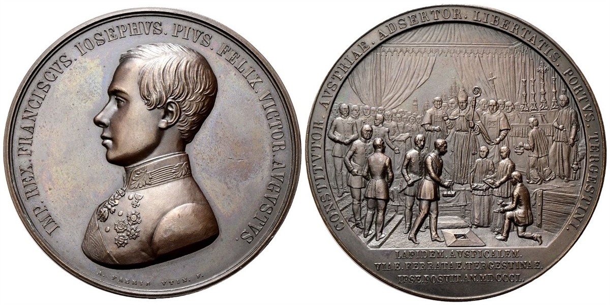 Dr. IMP REX FRANCISCVS IOSEPHVS PIVS FELIX VICTOR AVGVSTVS. Busto in divisa dell’Imperatore a s.; sotto, A FABRIS VTIN F. Rv. COSTITVROR AVSTRIAE ADSERTOR LIBERTATIS PORTVS TERGESTINI. L’Imperatore attorniato da seguito e assistito dal Clero si accinge alla posa della prima pietra della stazione; in esergo, LAPIDEM AVSPICALEM / VIAE FERRATAE TERGESTNAE / IPSE POSVIT AN MDCCC