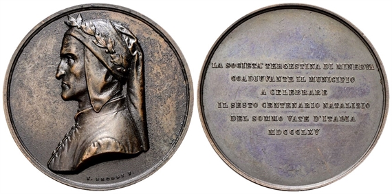 Dr. Busto laureato del Poeta a s.; sotto la troncatura della spalla; F BROGGI F. Rv. LA SOCIETA’ TERGESTINA DI MINERVA / COADJUVANTE IL MUNICIPIO / A CELEBRARE / IL SESTO CENTENARIO NATALIZIO / DEL SOMMO VATE D’ITALIA / MDCCCLXV. Iscrizione disposta su sei righe.