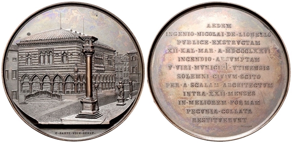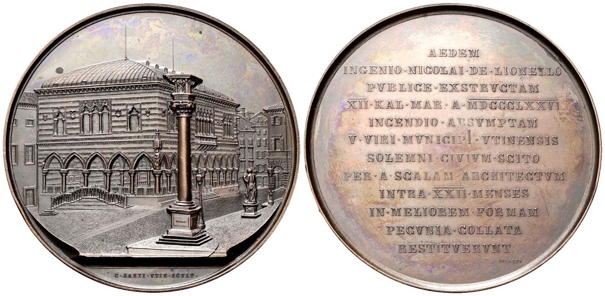 Dr. Prospetto del Palazzo Municipale di Udine detto Loggia del Lionello; in esergo, C SANTI VTIM SCVLP. Rv. AEDEM / INGENIO / NICOLAI / DE LIONELLO / PVBLICE EXSTVCTAM / XII / KAL MAR / A MDCCCLXXVI / INCENDIO ABSVMPTAM / V VIRI MVNICIPI VTINENSIS / SOLEMNI CIVIVM SCITO / PER A SCALAM ARCHITECTVM / INTRA XXII MENSES / IN MELIOREM FORMAM / PECVNIA COLLATA /