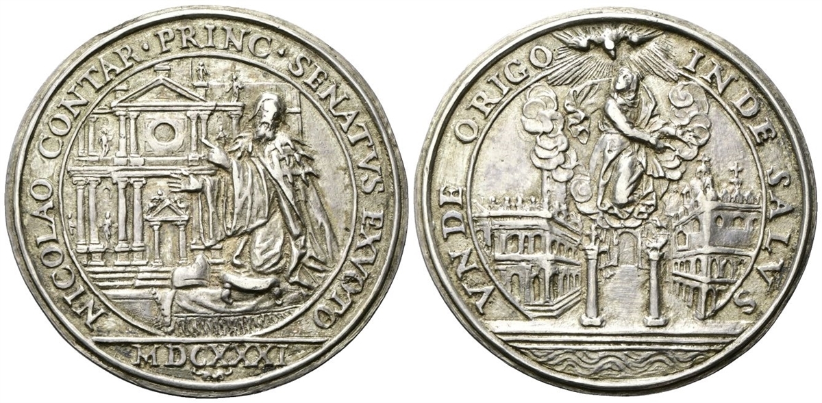 Dr. NICOLAO CONTAR• PRINC • SENATVS EXVOTO. Il doge genuflesso indica la facciata della nuova Chiesa di Santa Maria della Salute; in esergo, MDCXXXI. Rv. VNDE ORIGO - INDE SALVS. Veduta della piazza di San Marco con la Beata Vergine su nubi; sopra, la colomba dello Spirito Santo raggiante.