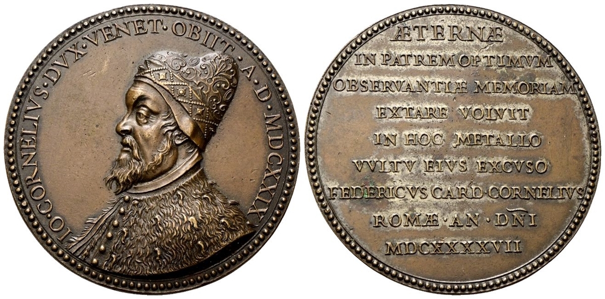 Dr. IO CORNELIVS DVX VENET OBIIT - A D MDCXXIX. Busto del Doge a s., con corno dogale e mantello. Rv. ÆTERNÆ / IN PATREM OPTIMVM / OBSERVANTIÆ MEMORIAM / EXTARE VOLVIT / IN HOC METALLO / VVLTV EIVS EXCVSO / FEDERICVS CARD CORNELIVS / ROMÆ AN [DOMINI] / MDCXXXXVII. Iscrizione disposta su nove righe.