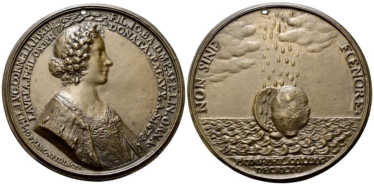 Dr. HEL LVC CORNELIA PISCOP - FIL IO BA D M P SEP LIN ORNA / LAVREA PHILOSOPH - DONATA PATAVY A S 1678. Busto a d., indossa corona d’alloro, mantello dottorale d’ermellino sopra la veste ricamata; sotto, IO FRANC NEIDINGER. Rv. NON - SINE FOENORE. Gocce di rugiada scendono dal cielo alimentando una conchiglia aperta galleggiante sulle onde del mare; in esergo, PATAV PHIL COLLEG / DECRETO.