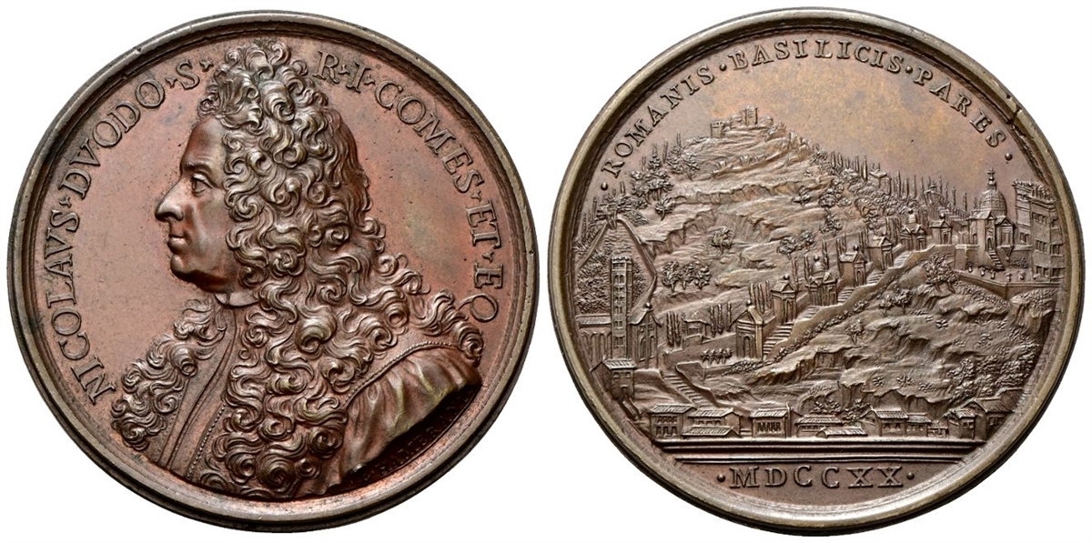Dr. NICOLAVS DVODO S - R I COMES ET EQ. Busto a s. con lunga parrucca; sotto, E HAMERANI. Rv. ROMANIS BASILICIS PARES (Pari alle basiliche romane). Veduta di Monselice, del Santuario delle Sette Chiese e della Rocca; in esergo, MDCCXX.