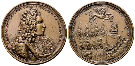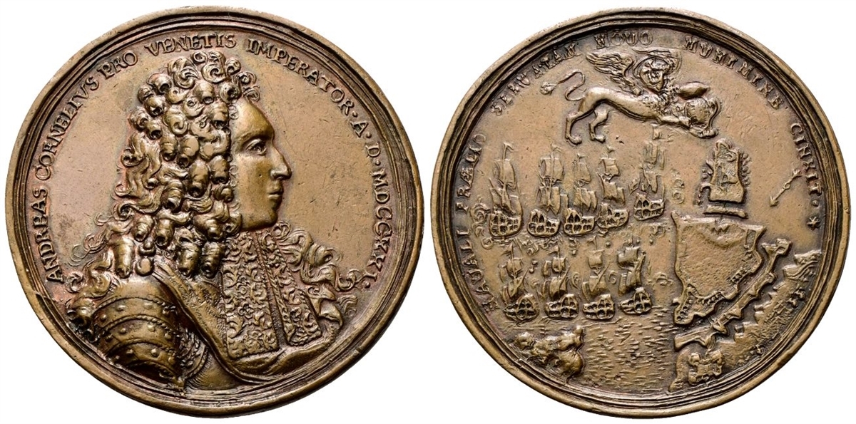 Dr. ANDREAS CORNELIVS PRO VENETIS IMPERATOR A D MDCCXXI. Busto a d. con corazza, veste sfarzosa e parrucca Rv. NAUALI PRAELIO SERVATAM NOUO MUNIMINE CINXIT. Pianta di Castelnuovo; sopra, il Leone di San Marco verso d. regge lo stemma Corner; a s., nove galere disposte a gruppi di cinque e di quattro solcano i mari.