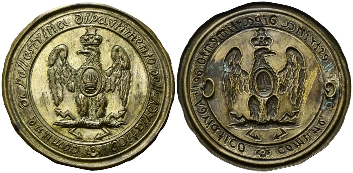 con corona reale a cinque punte, tra gli artigli stringe un fascio di fulmini. Rv. Impronta negativa del dritto.