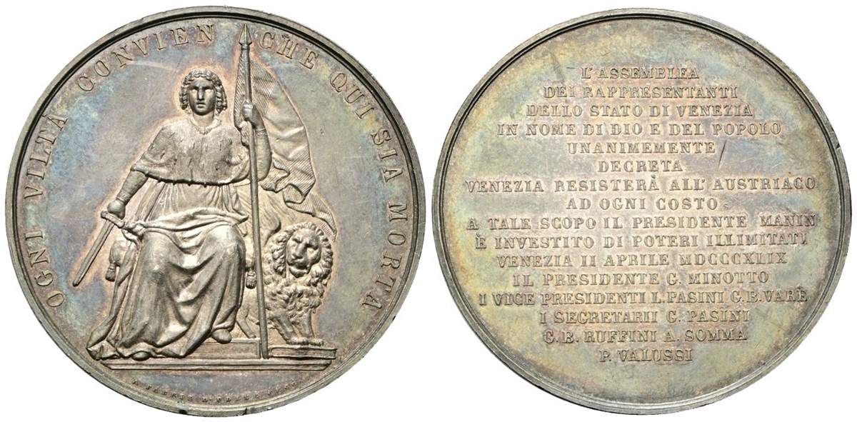 Dr. OGNI VILTA’ CONVIEN CHE QUI SIA MORTA. La Repubblica di Venezia, seduta di fronte con vessillo e spada, di fianco il leone alato di San Marco co Vangelo Chiuso. A FABRIS D’UDINE FECE. Rv. L’ASSEMBLEA / DEI RAPPRESENTANTI / DELLO STATO DI VENEZIA / IN NOME DI DIO E DEL POPOLO / UNANIMANENTE / DECRETA / VENEZIA RESISTERà ALL’AUSTRIACO / AD OGNI COSTO / A TALE SCOPO IL PRESIDENTE MANIN / E’INVESTITO DI POTERI ILLIMITATI / VENEZIA II APRIL