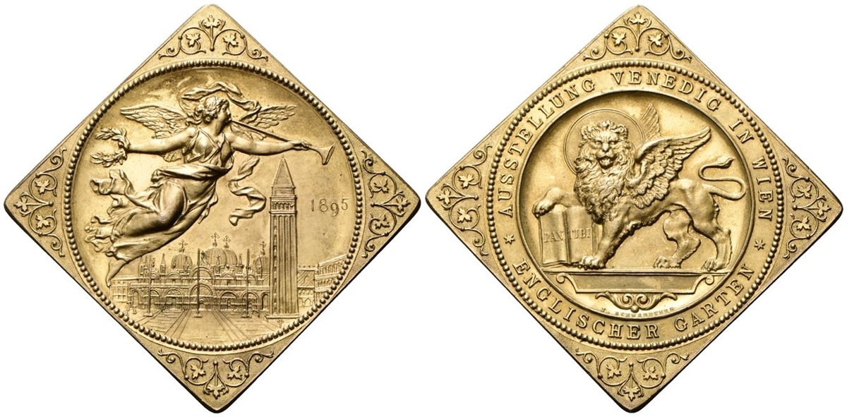 Dr. La fama, volteggia in cielo, nella d. una corona d’alloro e con la s. si porta alle labbra una tromba; sotto, Campanile e Basilica di San Marco; a d., 1895 (inciso), tutto entro rombo con fregi contenente un cerchio. Rv. AUSTELLUNG VENEDIG IN WIEN / ENGLISCHER GARTEN. Leone di San Marco con Vangelo aperto sul motto: PAX TIBI; sotto il Leone, J. SCHWERDTNER.