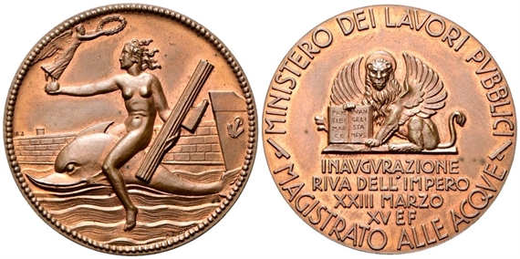 Dr. Figura muliebre su dorso di delfino verso s. tra marosi, regge fascio e Vittoria su globo; sullo sfondo, banchisa; a d., prua di nave; in esergo, A. JACCUZZI Rv. MINISTERO DEI LAVORI PVBBLICI / MAGISTRATO ALLE ACQVE. Leone di San Marco; sotto, INAVGVRAZIONE / RIVA DELL’IMPERO / XXIII MARZO / XV EF.