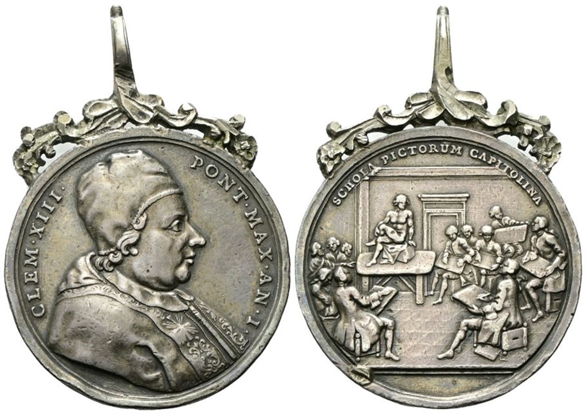 Dr. CLEMENS XIII - PONT MAX. Busto a d. con camauro, mozzetta e stola ornata con croce. Rv. SCHOLA PICTORUM CAPITOLINA. Giovani allievi ritraggono un soggetto nudo.