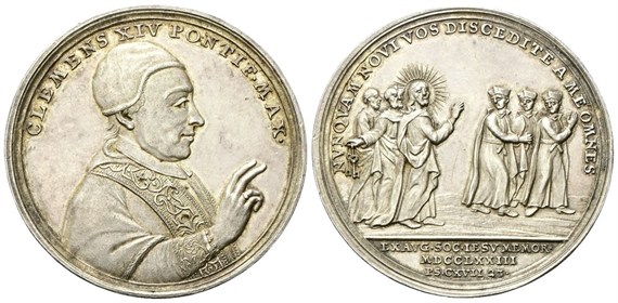 Dr. CLEMENS XIV PONTIF MAX. Busto benedicente a d., con camauro, mozzetta e stola ornata. Rv. NVNQVAM NOVI VOS DISCEDITE A ME OMNES. Gesù radiato seguito dagli Apostoli Pietro e Paolo scaccia un gruppo di tre Gesuiti; in esergo, EXAVG SOC IESV MEMOR / MDCCLXXIII / PSCVII 23.