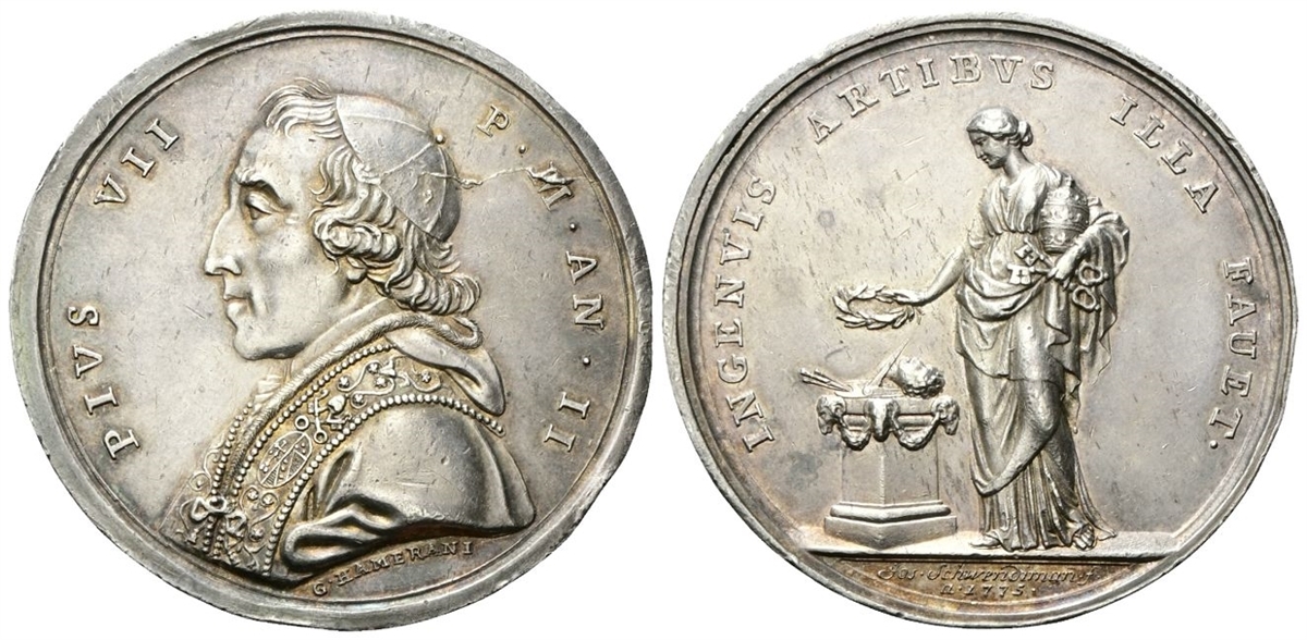Dr. PIVS VI - P M AN II. Busto a s. con zucchetto, mozzetta; sotto il busto, G. HAMERANI. Rv. INGENIVS ARTIBVS ILLA FAUET. Figura allegorica femminile rappresentante la Religione stante verso s., che depone una corona d’alloro su un’ara posta a s.,adornata con festoni e teste di arieti; in esergo, JOS SCHWENDIMAN / A 1775.