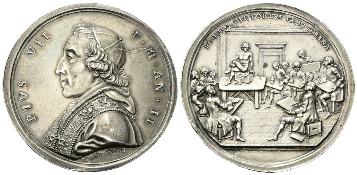 Dr. PIVS VII - P M AN II. Busto a s. con zucchetto, mozzetta; sotto il busto, G.HAMERANI. Rv. SCHOLA PICTORUM CAPITOLINA. Giovani allievi ritraggono un soggetto nudo.