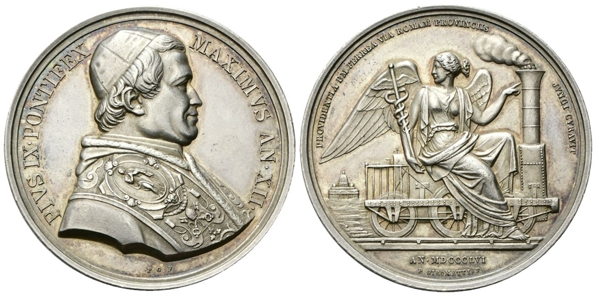 Dr. PIVS IX PONTIFEX - MAXIMVS AN XII. Busto a s., con zucchetto, mozzetta e stola decorata con l’Immacolata; sotto, P G F. Rv. PROVIDENTIA P M FERREA VIA ROMAM PROVINCIIS - JVNGI CVRAVIT.Vaporiera con sopra un angelo seduto che regge un caduceo e indica la via ferrata; a s., sullo sfondo, il Cupolone; in esergo, AN MDCCCLVI / P GIROMETTI F.