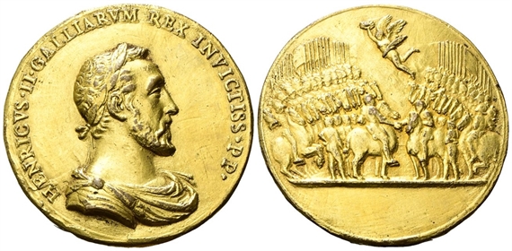 Dr. HENRICVS II GALLIARVM REX INVICTISS PP. Busto laureato e drappeggiato a s. Rv. Due generali a cavallo si stringono la mano mentre la Vittoria in volo li incorona; attorno, la cavalleria schierata.