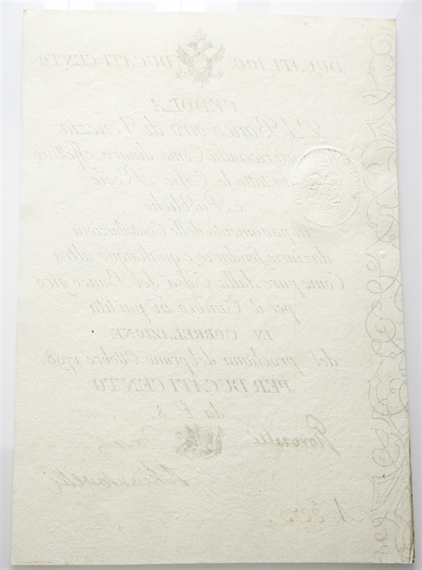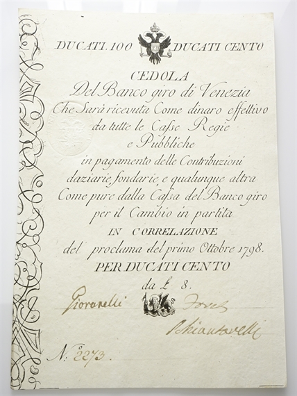 Cedola Banco Giro di Venezia. 100 Scudi 1798, firme Giovanelli - Fovel - Schiantarelli.