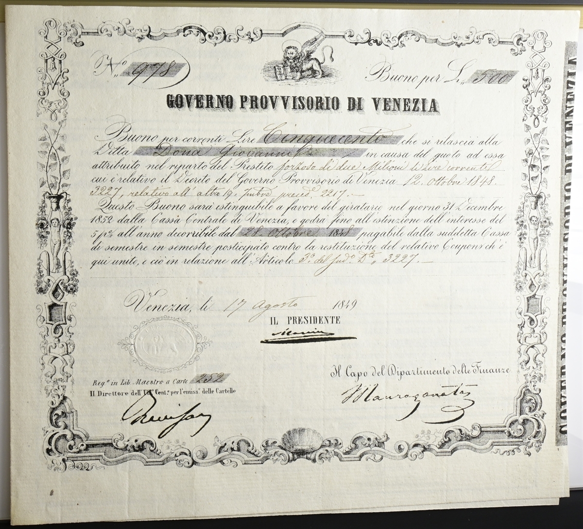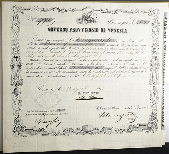 Governo Provvisorio della Repubblica Veneta. Buoni del Prestito, 1848-1849. Buoni del prestito forzoso di tre milioni (di Venezia) decreto n. 3227 del 12 Ottobre 1848. 500 Lire, 17 Agosto 1849.